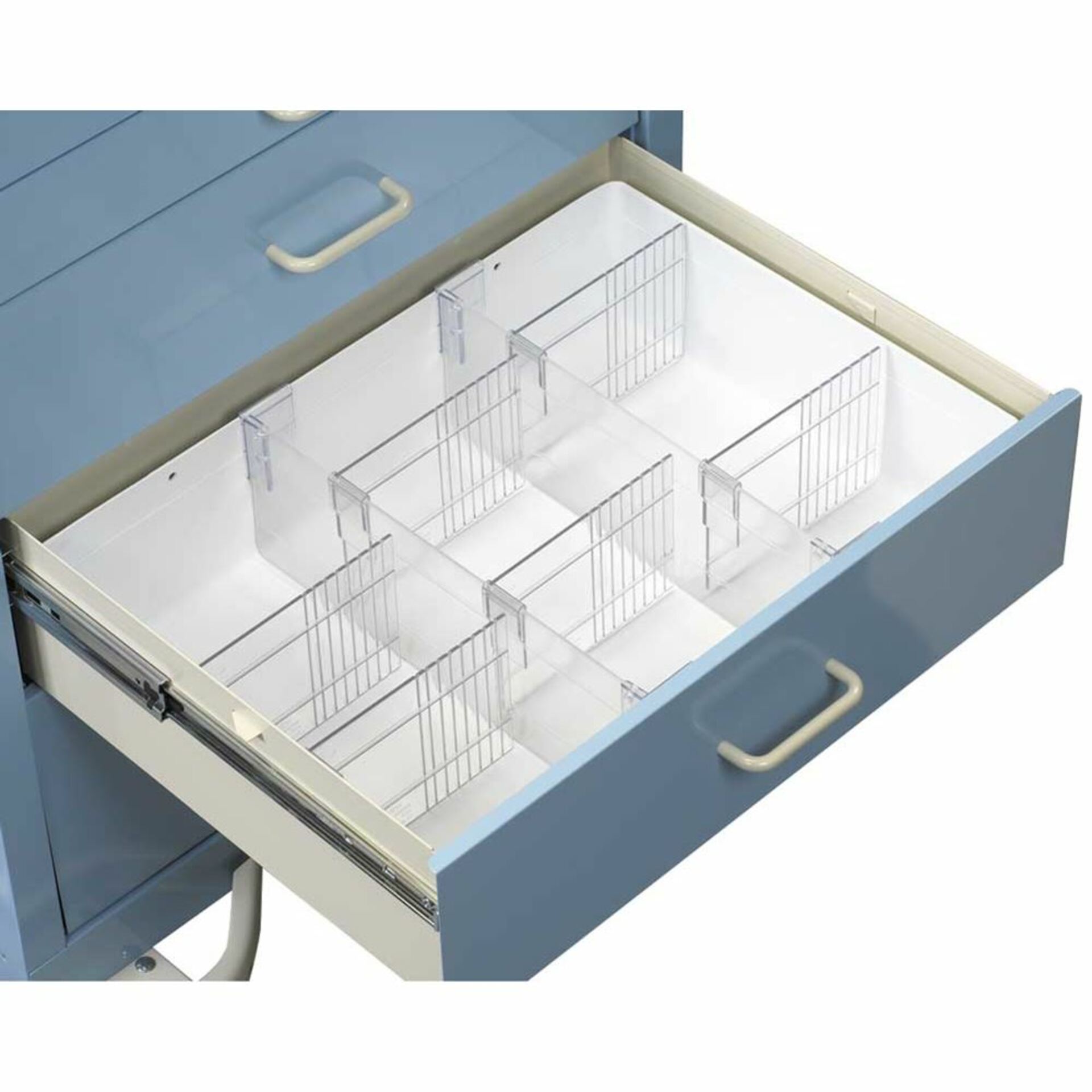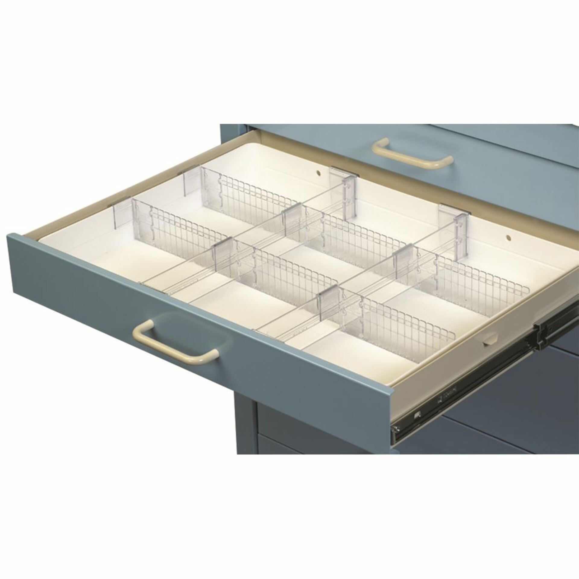 AliMed® Cart Accessory, Full Drawer Tray w/Dividers, Ampule Holders, and Rails for Select and Standard/Wide Series Carts. Movable rails and dividers allow for custom storage configurations creating up to 20 compartments. Sold individually, cart not included.