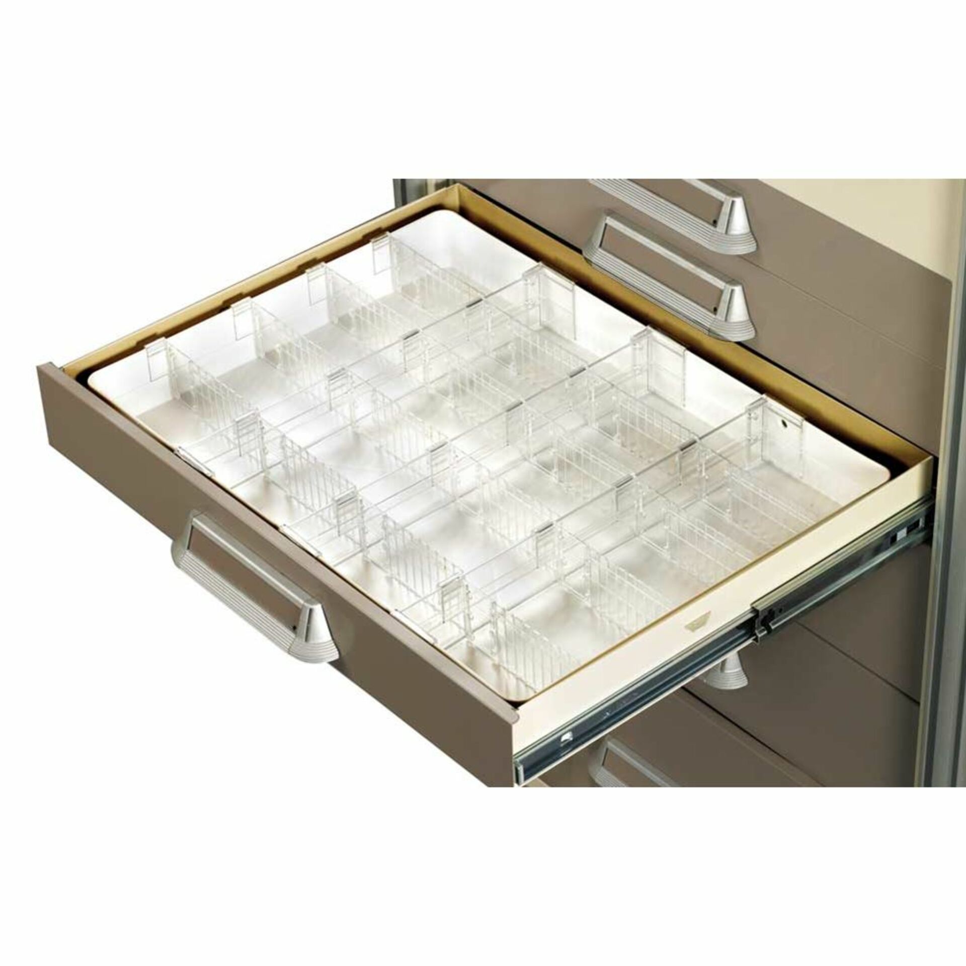 938500: Full Drawer Tray, 21-1/2″W x 2-5/16″H x 15-1/2″D, 8 dividers, 14 ampule holders, and 2 rails for 3″H drawers (Select, Standard/Wide)