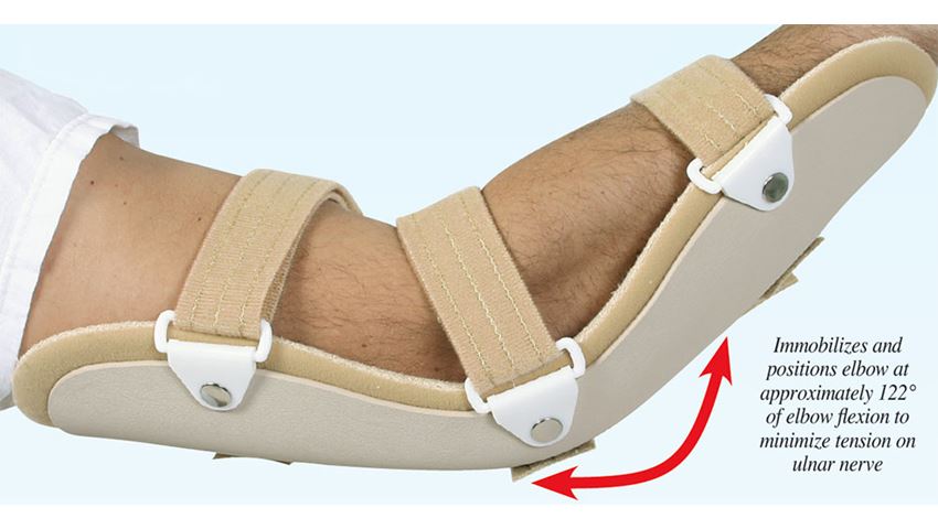 Immobilizes and positions the elbow at 122° so that the ulnar nerve is less prominent