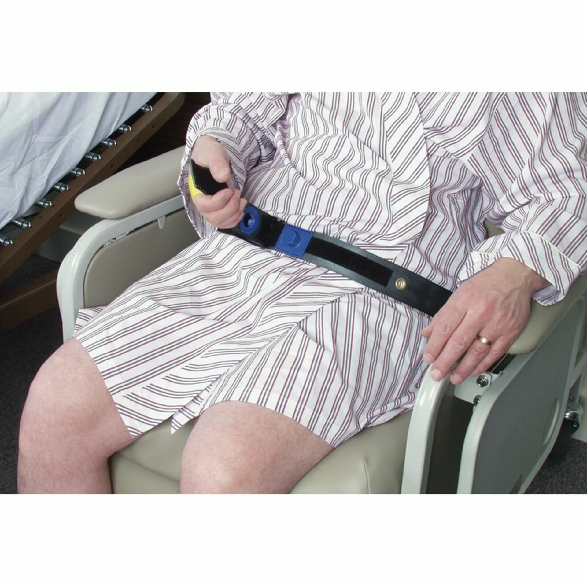AliMed® E-Z Release Seatbelt Hook-and-loop fastener belts are ideal for high-risk, active patients. Once patient begins unfastening belt, alarm is triggered. After triggering alarm, patient must unfasten an additional 12″ of hook-and-loop fastener before they are free to rise.
