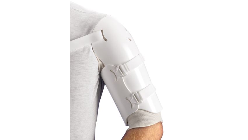AliMed® Humeral Fracture Orthosis (over-the-Shoulder) (HFB-OS) for diaphyseal humeral fractures, support after removal of internal or external fixation, or as an adjunct to internal fixation. Two-part medial/lateral construction increases circumferential compression. 1/8″-thick foam padding. Plastic deltoid extension adds protection and helps prevent distal migration. Full elbow ROM. Includes two stockinette sleeves. Fits left or right.