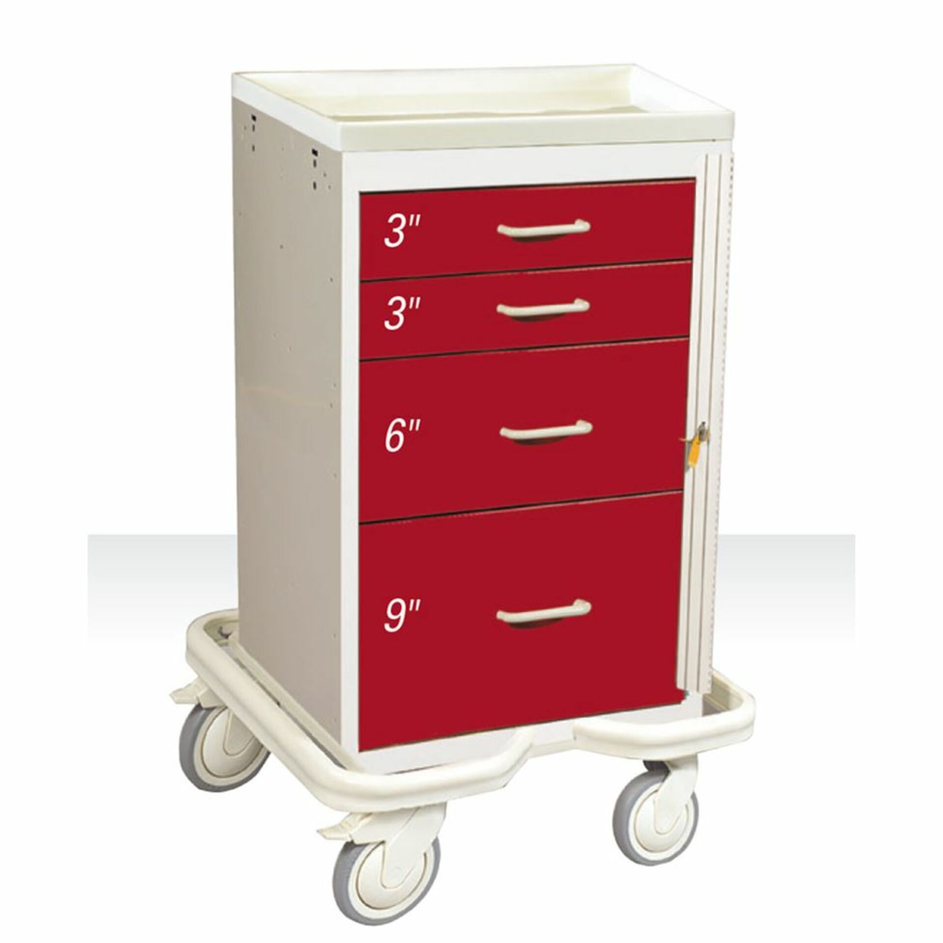 AliMed® Mini Series 4-Drawer Emergency Cart The ultimate space saver, these carts feature a narrow design that easily fits under counters or at beside. Ideal for emergency procedures when space and mobility needs are limited. Choose Solid Beige only or two-tone Beige frame with choice of drawer color: Beige, Dark Blue, Red, Slate Blue, or Yellow.
