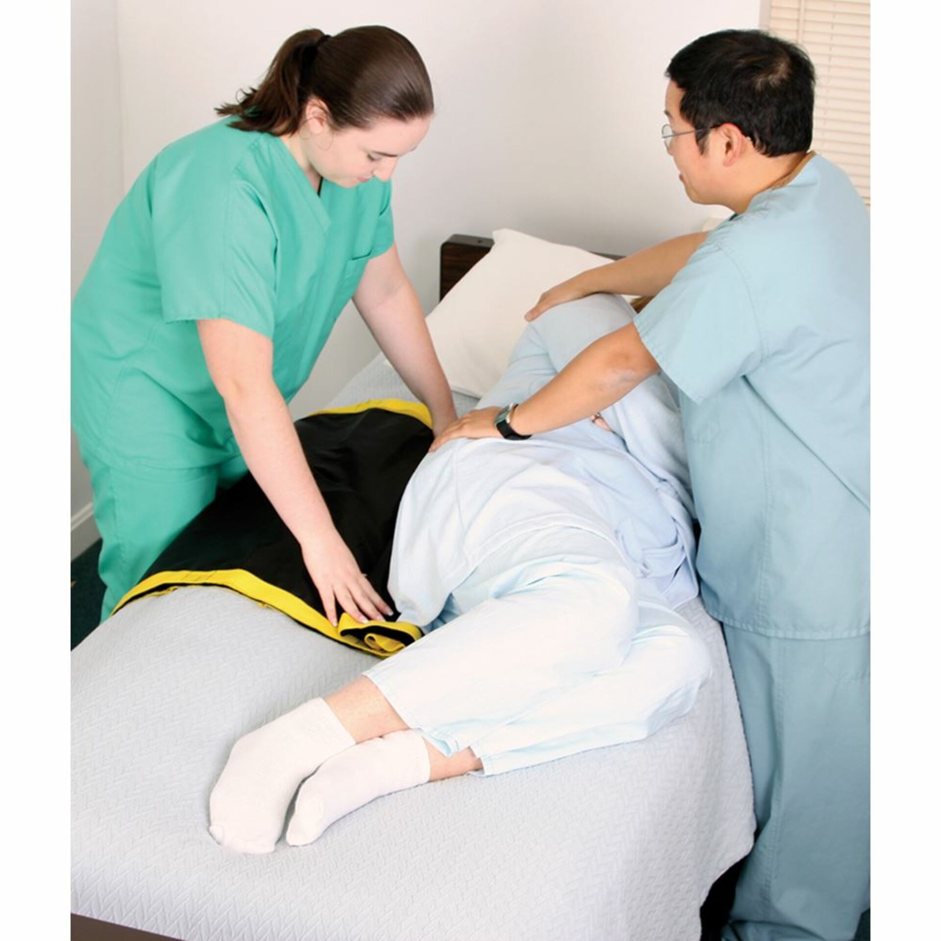 Pull the reinforced straps toward your body. The resident rolls over and is moved to the bed’s opposite side.