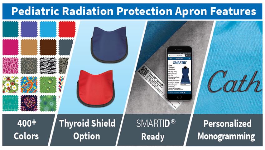 AliMed® Pediatric Frontal Radiation Protection Apron Lightweight, lead-free design is lighter than standard lead aprons and sized for a child’s anatomy, providing comfort and security for your smallest patients. Offers full 0.5 mm Pb-equivalent front protection. Shoulder strap in back adds security while redistributing weight to reduce stress on neck, shoulders, and back. Hook-and-loop shoulder closure and soft 1″W crisscrossing tie at the waist for adjustability and a snug, comfortable fit. Includes shoulder pads and pocket. Not made with natural rubber latex. Available in 400+ colors and prints (see details below). Set includes one of each size, choose one color or print for all three aprons (see order form for details).