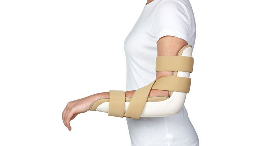 Posterior 90° Flexion Elbow Orthosis Removable, terry-foam laminated interior. Use for epicondylectomy fractures of the humeral/forearm – anywhere 90° of elbow flexion is required. Straps included. Multiform™ plastic. Fits right or left. Adjust with heat gun.