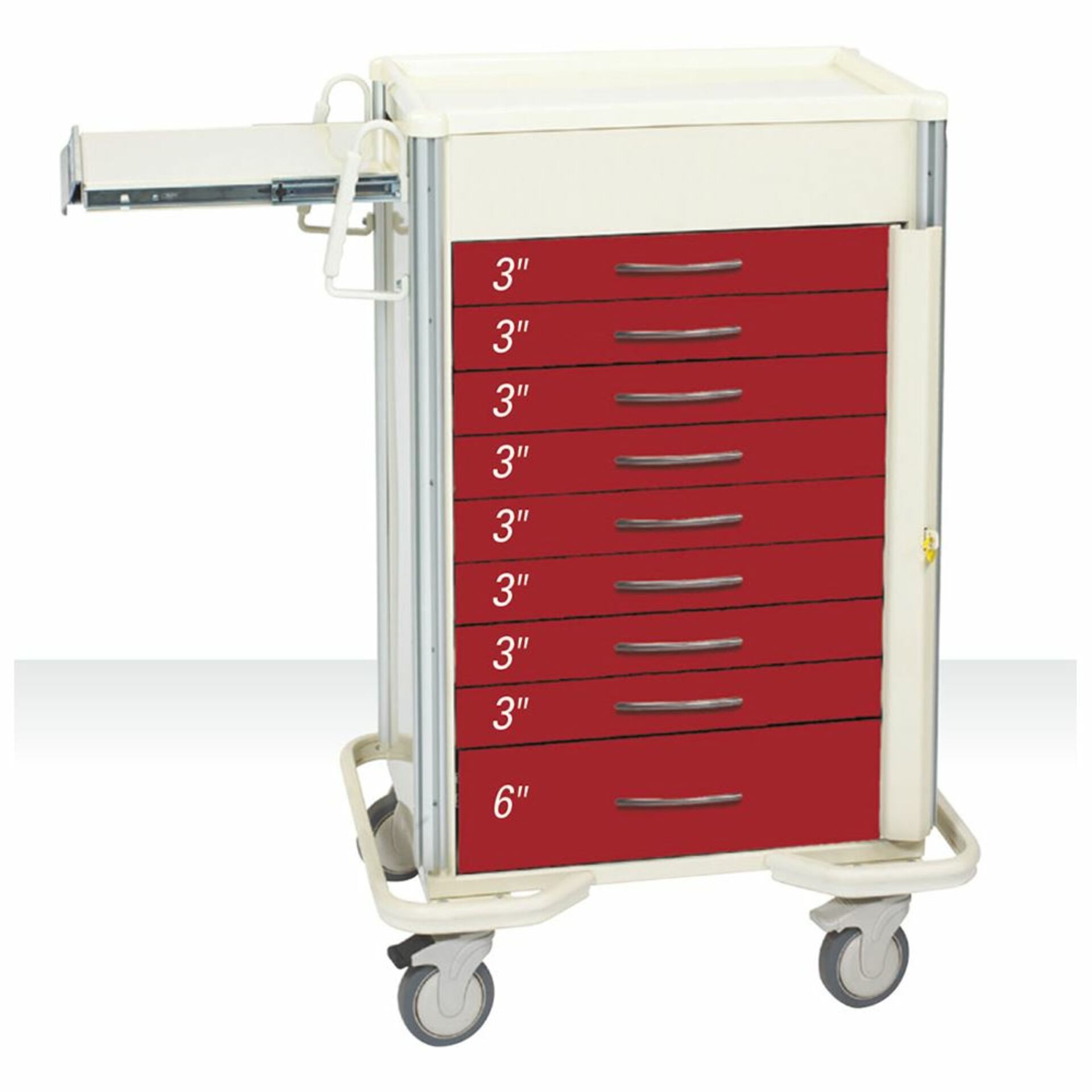 AliMed® Select Series 9-Drawer Emergency Cart 30% lighter than our Standard Series, allowing better control and maneuvering for effortless handling that gets you there faster. Loaded with features, including a larger work space to keep supplies organized and accessible during procedures and extrusion corners and movable mounting panels to load up on accessories. Choose from five drawer colors in matching solid frame or two-tone Beige frame: Beige, Dark Blue, Red, Slate Blue, or Yellow.