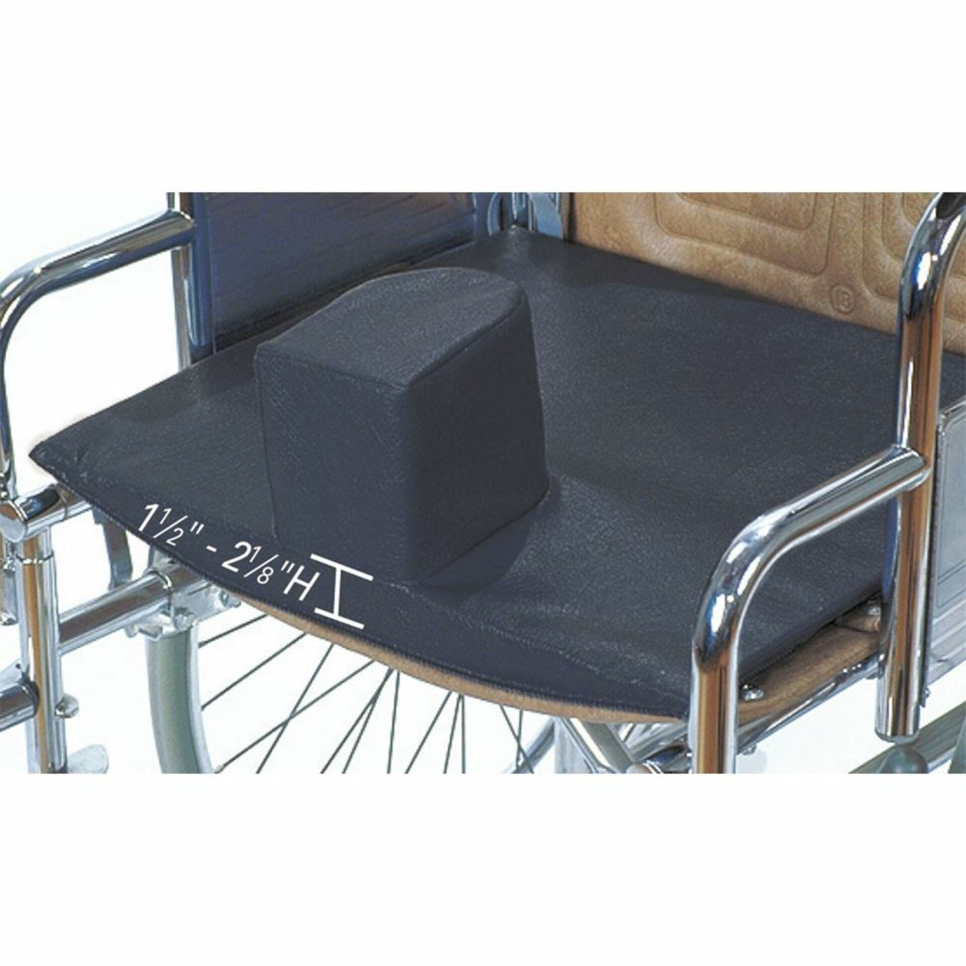The solid seat insert is only 1-1/2″ thick at the center and effectively fills sling seat sag. The cushion is upholstered in slip-resistant, liquid-resistant vinyl. Back ties included, plus a square of ScootGard which can be used between the cushion and seat to prevent slippage.