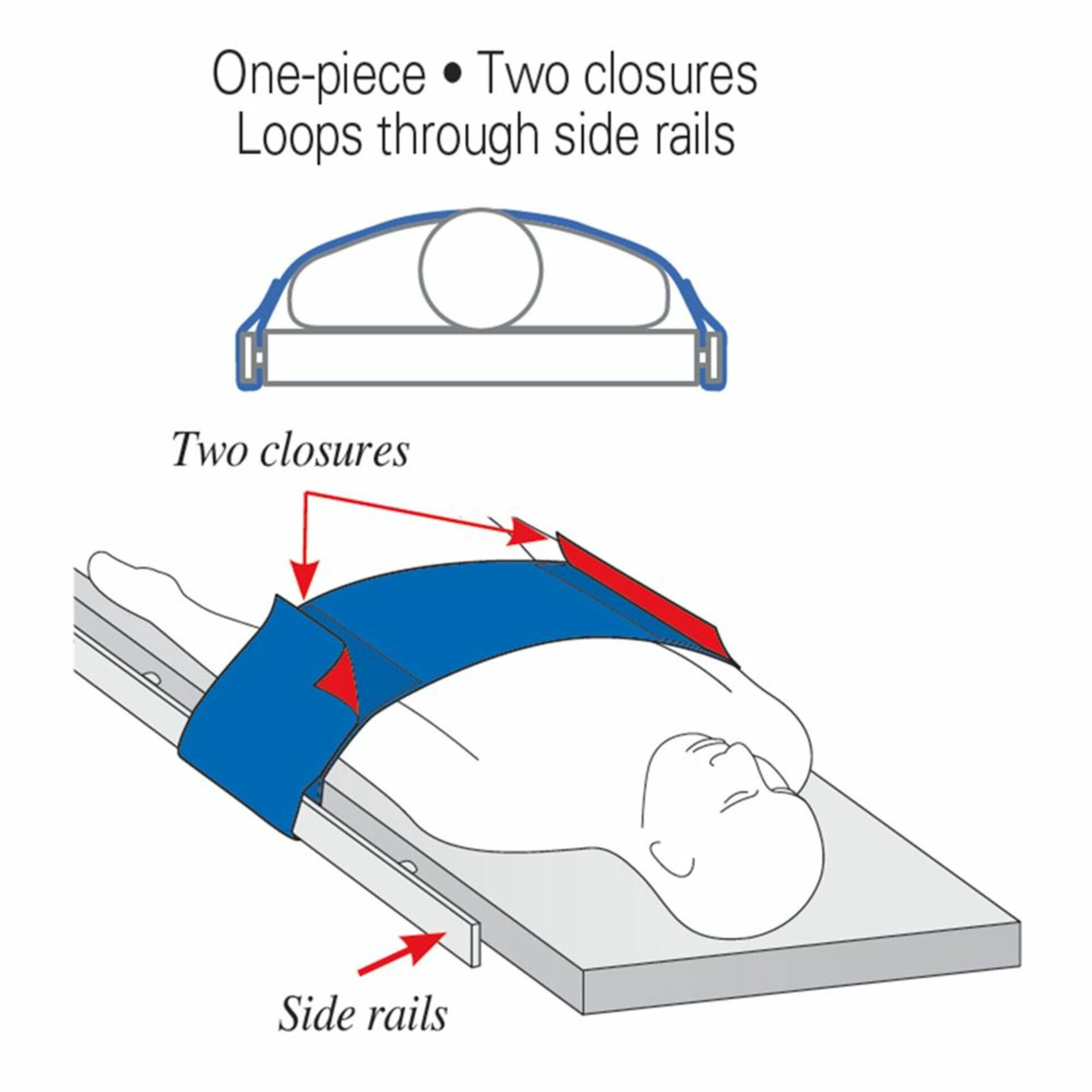 AliMed® Universal Straps, 1-Piece, 2 Closures, Side Rail Hold are extraordinarily strong straps and can accommodate just about any patient. Highly versatile, the wide, soft double-sided blue loop material allows the red hook portion to securely adhere to any area on either side. With two closures, accommodate smaller patients by cinching up the side rail ends. Available in multiple widths and lengths for patients of any size.