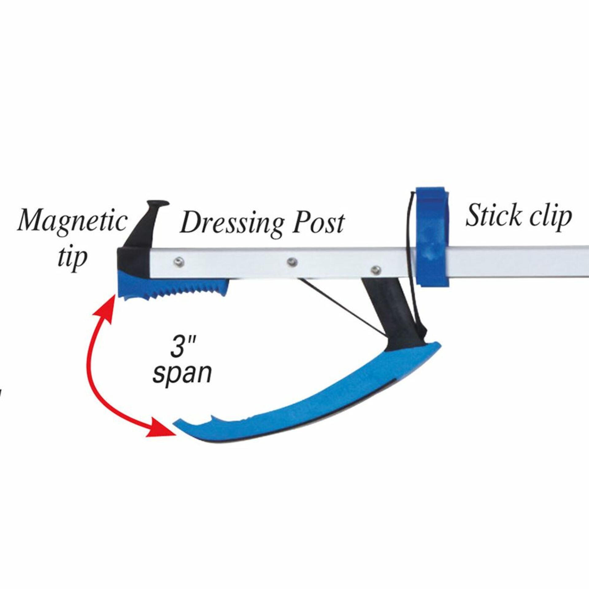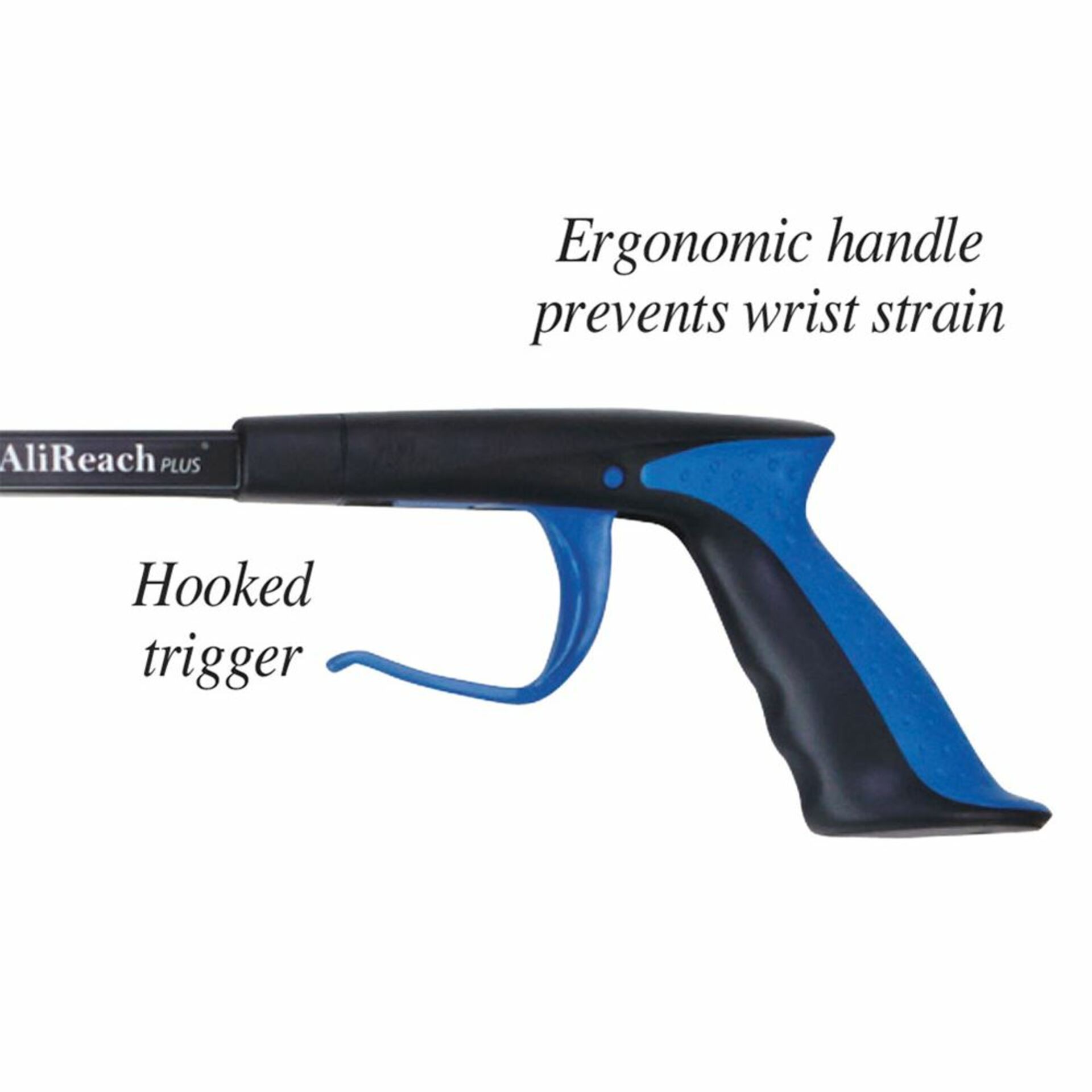 AliReach Plus Standard Reacher is an assistive device for grasping items in hard-to-reach places without bending over. Allows users to maintain independent living. Ergonomic “comfy grip” handle with hooked trigger provides a secure grip without straining the finger or wrist. Magnetic tip on front of grabber helps retrieve keys, pins, and other smaller metal items, while the Gripcert® jaw makes it easy to lift heavier or more delicate objects, such as paper or fabric. Blue stick clip allows reacher to be attached to a walking aid. Ideal for those with weak hands or arthritis. 32”L version also available. Handle/Jaw: Blue/Black.