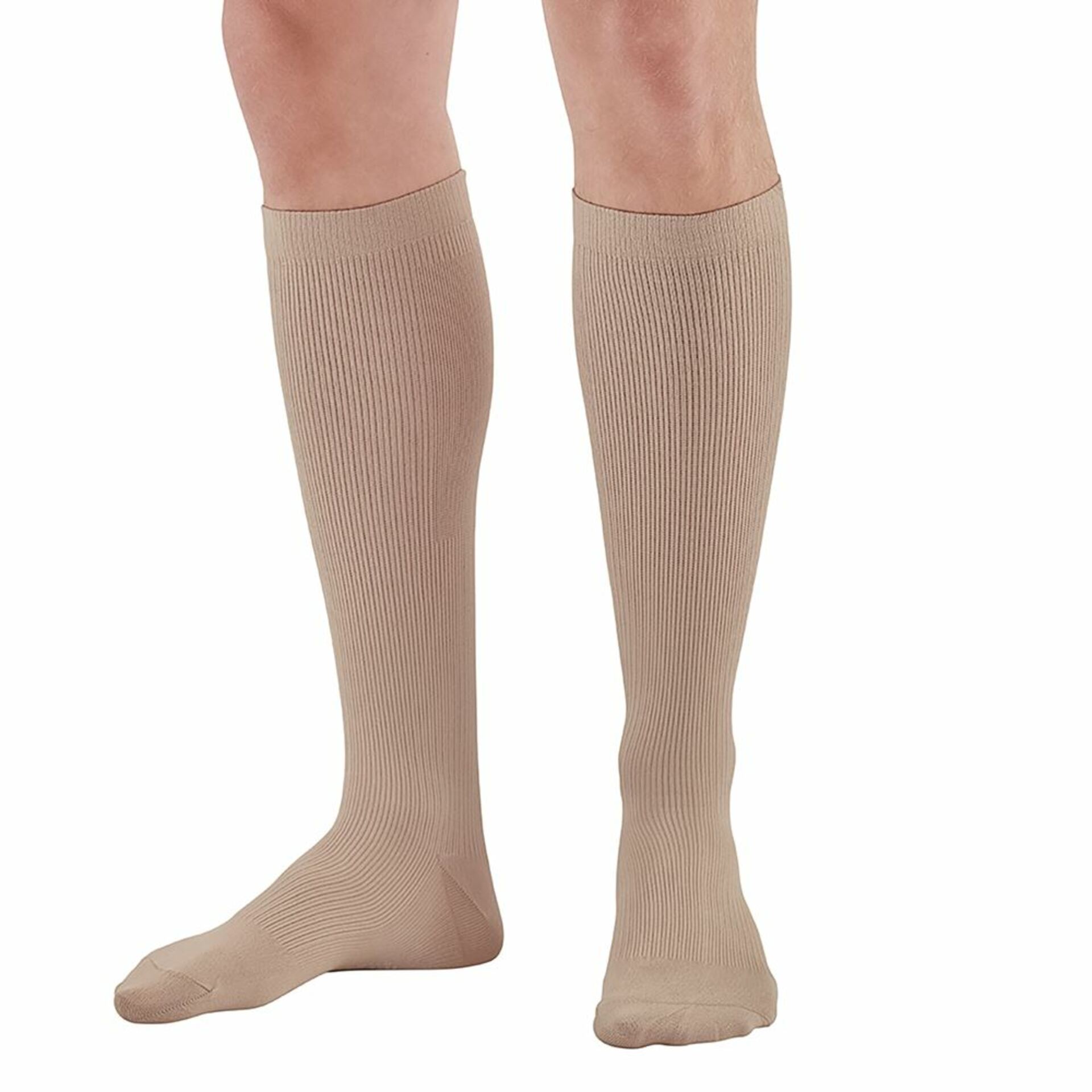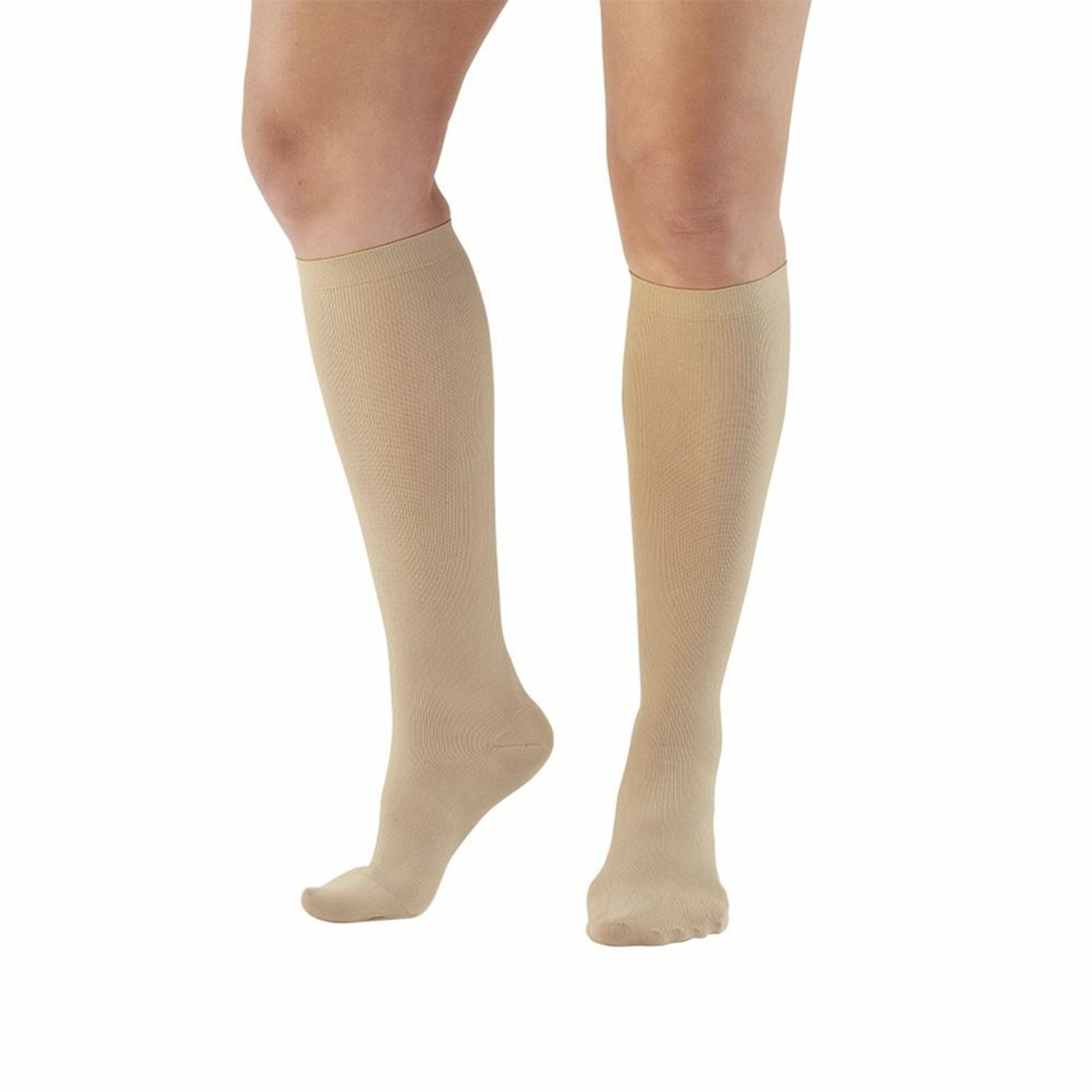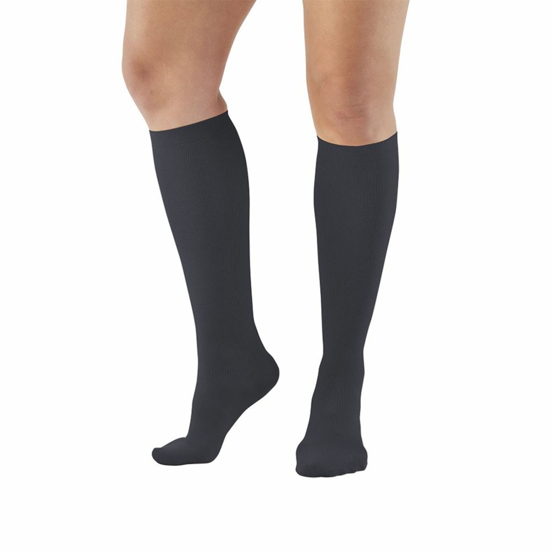 Ames Walker® Support Microfiber Socks, Knee-Length are comfortable, lightweight and offer moderate compression for everyday relief. Encourage circulation to help legs feel energized during long periods of immobility such as traveling by air or during long car rides, which can lead to blood clots and Deep Vein Thrombosis (DVT). Closed toe, made from soft, microfiber nylon and spandex for versatile fashion and great value. Not made with natural rubber latex.