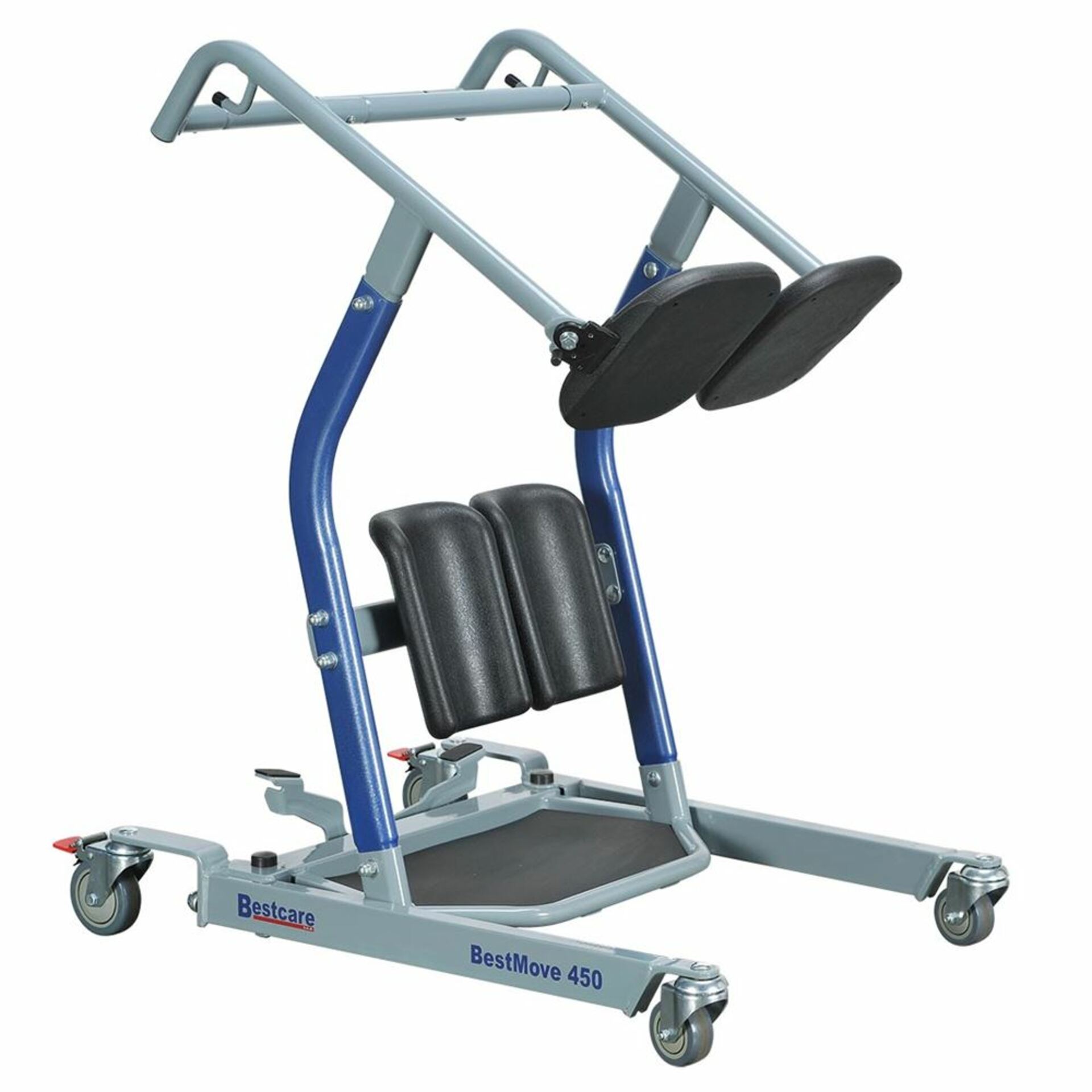 Bestcare BestMove™ Standing Transfer Aid helps keep the resident engaged in the lifting process, with minimal caregiver assistance. Padded split seat swings out to allow loading or unloading and swings back to form a comfortable and secure seat for transport. Includes dual kneepads, nonslip foot rest, and locking rear casters. 400-lb. Capacity model has a fixed base with narrow and tapered-positioned legs to squeeze in tight spaces. 450-lb. Capacity model has base legs that easily open to fit around wheelchairs for easier patient transfers.
