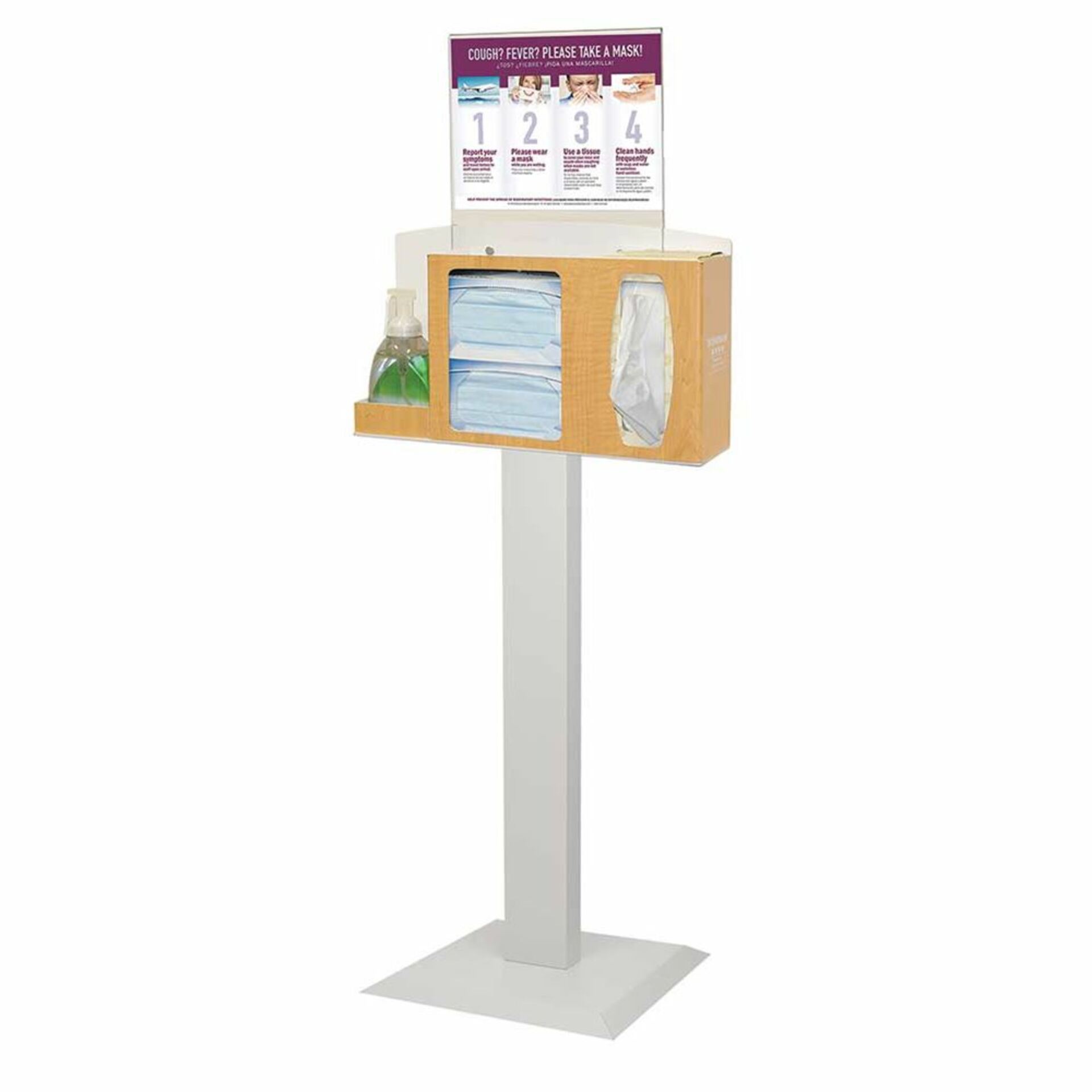 Easy-to-assemble kit includes respiratory hygiene station, horizontal sign holder, and stand
