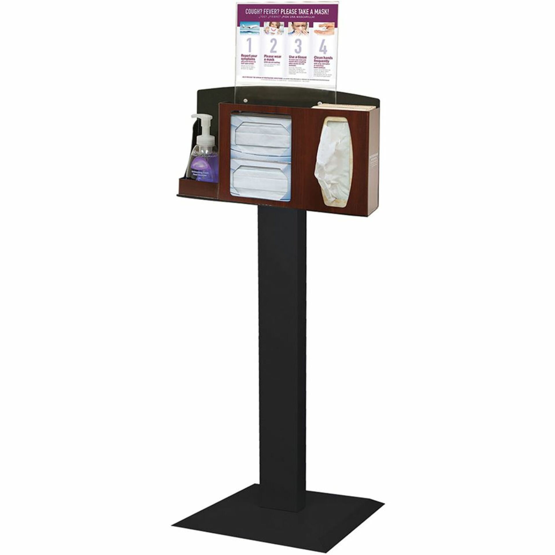 Bowman® Cover Your Cough Compliance Kit, Stand, Hand Sanitizer Holder, Horizontal Sign Holder holds an assortment of personal protection equipment in one convenient and attractive dispenser. Durable hygiene station easily mounts to powder-coated steel floor stand. Ideal for use in public waiting areas, offices, and lobbies. Available in three color styles: Quartz Beige station (available in ABS plastic or powder-coated steel) with Quartz Beige floor stand, Fauxwood Maple station (ABS plastic) with White floor stand, or Fauxwood Cherry station (ABS plastic) with Black floor stand.