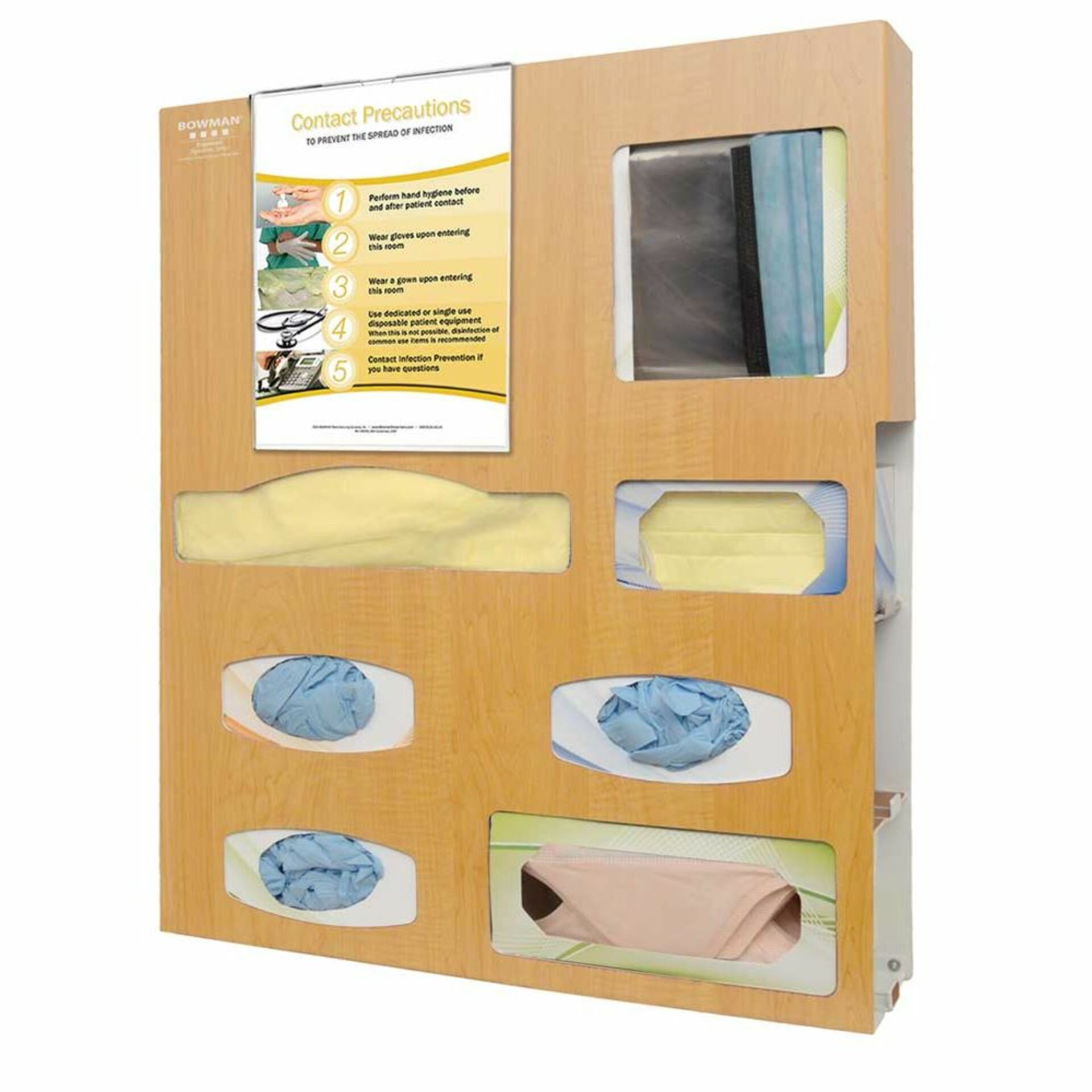 Bowman® Protection System Isolation Kit, Tri-Glove, Clip-On Sign holds an assortment of personal protection equipment in a convenient and attractive dispenser. Durable ABS plastic system features open sides for easy stocking and a built-in storage area that holds a variety of medical supplies. Ideal for patient care areas where isolation is required, including oncology clinics, dialysis centers, and clinic exam areas. Available in Quartz Beige, Fauxwood Maple, or Fauxwood Cherry.