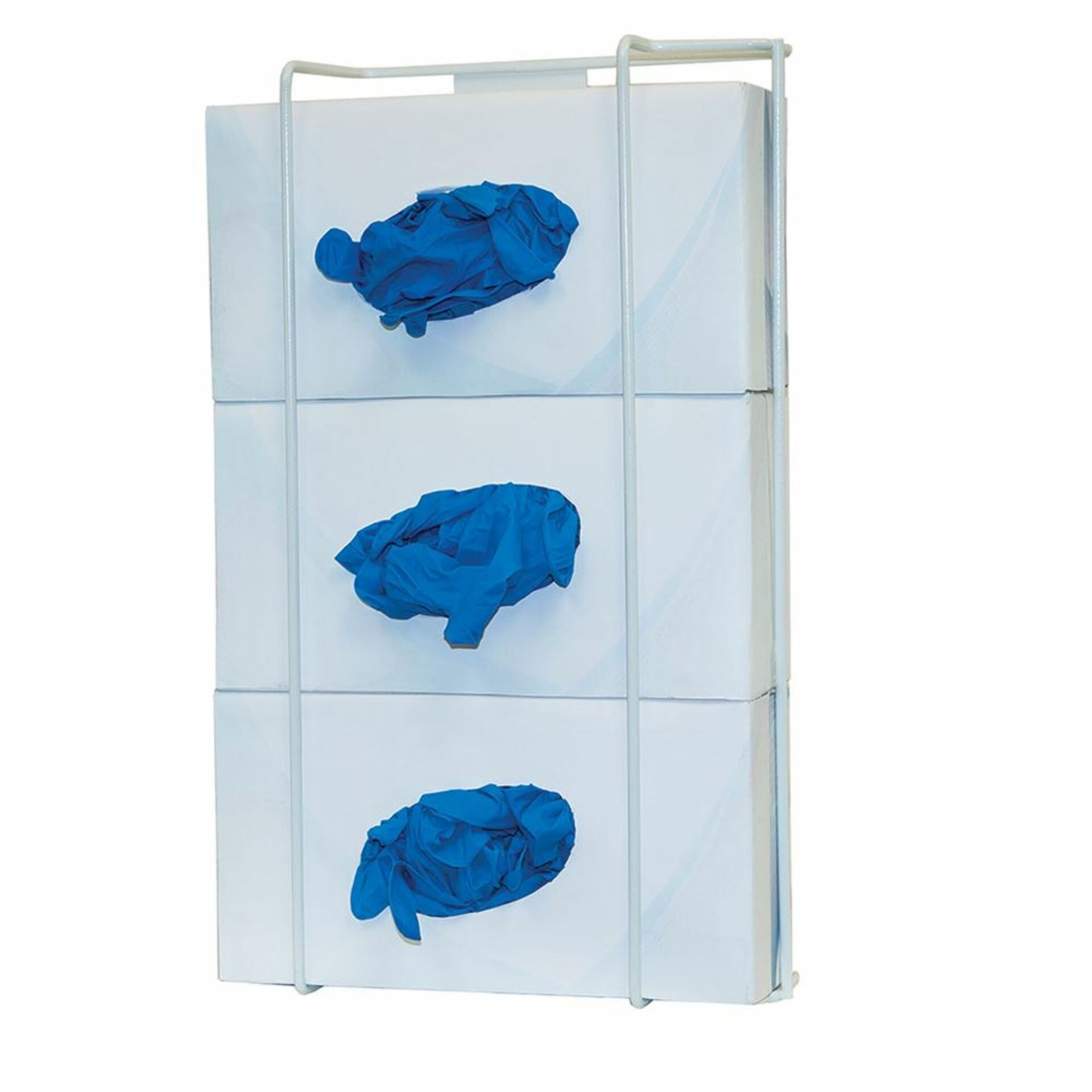 Bowman® Triple Glove Box Dispenser, Wire, without Dividers holds three boxes of most brand name standard gloves. Includes slot-style screw holes for vertical or horizontal wall mounting. Made from White coated wire. Ideal for anywhere glove boxes are needed.