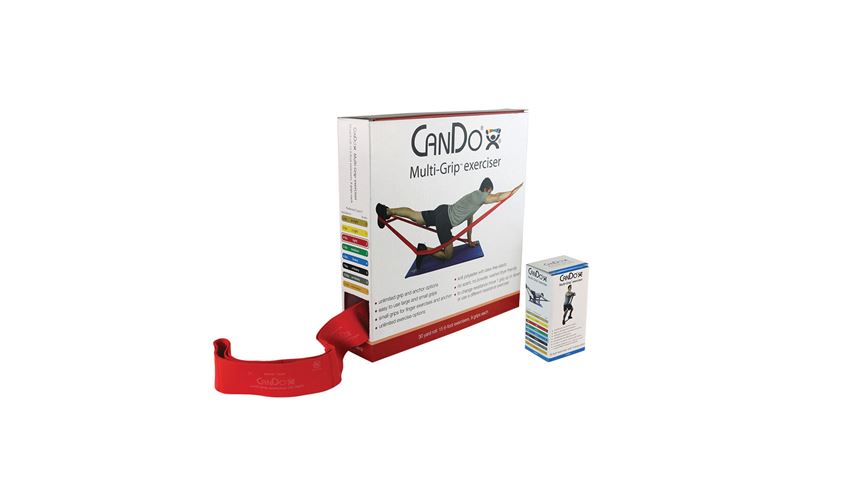 CanDo® Multi-Grip™ Exerciser Provides unlimited options for high-impact performance exercises. Contains easy-to-grip large and small loops. Use small loops as an anchor or for finger exercises. Use the nine larger loops around hands and feet to perform upper and lower body exercises. Easily change resistance by moving one loop up or down on exerciser. Progressively exercise with eight color-coded resistance levels. Unscented cloth. Not made with natural rubber latex. No powder coating. 30-Yd. Roll contains 15 exercisers with 135 total large loops. Washable. 2″W.