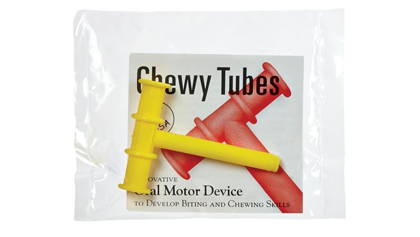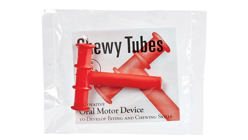 Chewy Tubes® An innovative oral motor device designed to provide a resilient, non-food, chewable surface for developing and practicing biting and chewing skills. Has a safe, non-toxic surface, is lead-free, and has no PVC or phthalates. A tube is presented laterally into the mouth. The stem of the tube is touched to the cutting surface of the molar teeth/gum. Use under supervision after jaw assessment. May be cleaned by washing with mild soap and water. Kit contains: six yellow tubes with a small stem size, six red tubes with a wider stem, and instruction sheet.