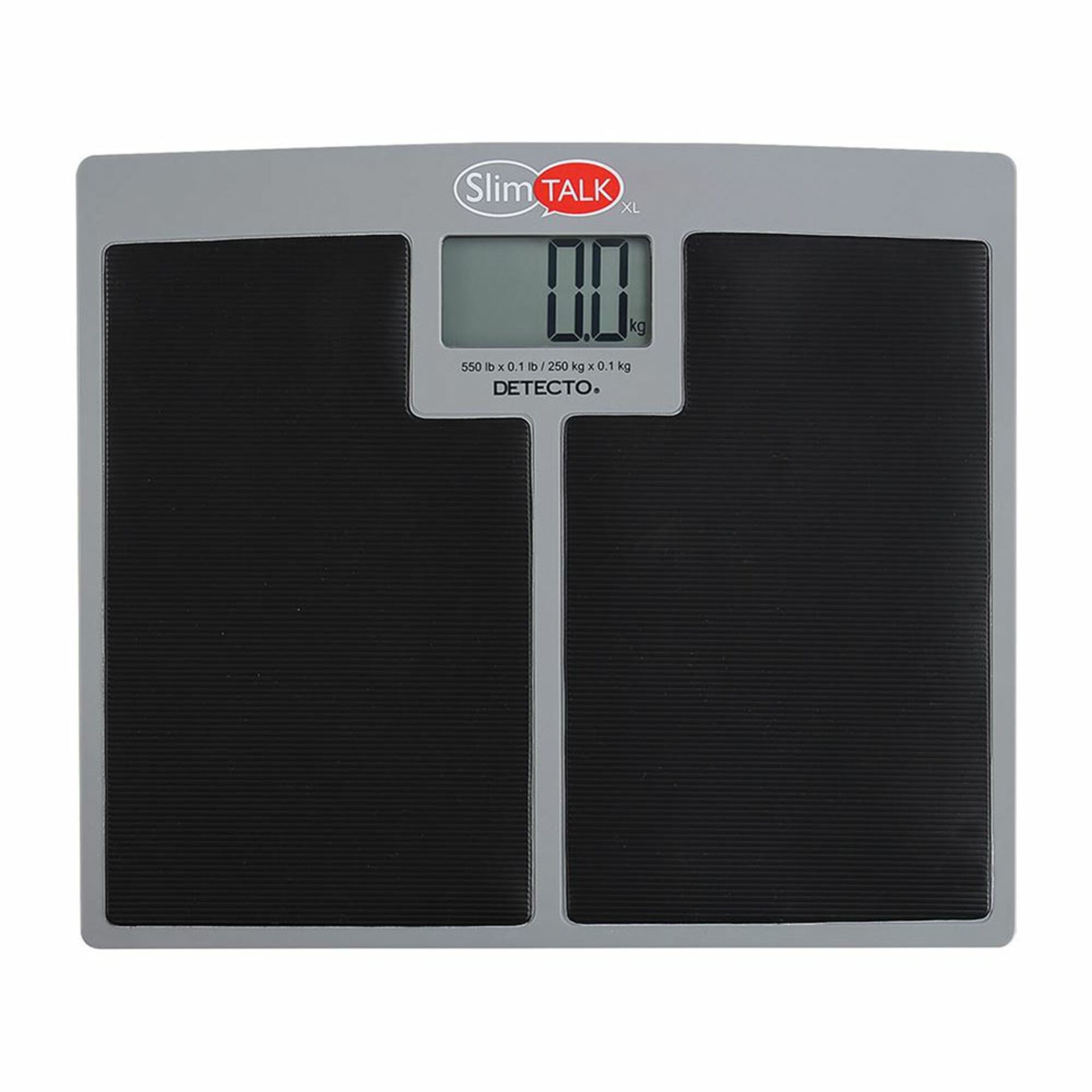 DETECTO® SlimTalk and SlimTalk XL talking bathroom scales are ideal for people of all sizes, the elderly, and vision-impaired users. Easy to use at home—the low-profile platform is only 1-2/5″H for easy access and is extra wide to accommodate users of all sizes. The bilingual scales announce weight in a clear, pleasant voice in either English or Spanish. Both models feature a clear readout in large, 1-1/2″H LCD digits, a step on/off function to allow weighing without stooping, and a durable plastic platform with textured surface for weighing traction and user safety. Five carpet feet and 3 AAA batteries included.