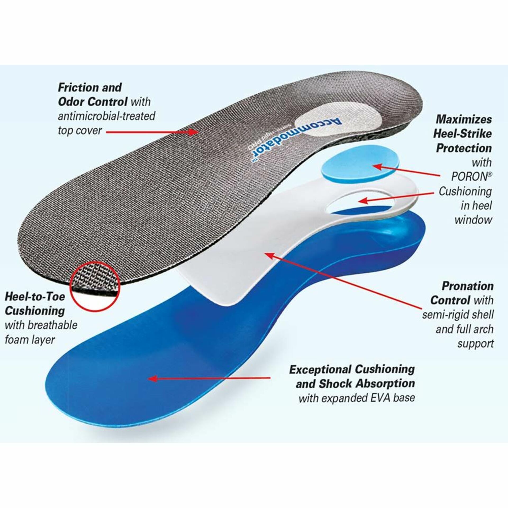 Accommodator semi-rigid PRO is a multi-layer insole made up of an expanded EVA base layer that easily accepts glued modifications. The semi-rigid shell is comprised of a full arch support and deep heel cup that cradles the hindfoot and offers moderate pronation control. Heel window within shell is filled with PORON® Cushioning to add extra cushioning at heel-strike – an important feature for athletes and patients who are on their feet a lot. The top layer is a breathable foam that wicks away moisture. The foam layer is laminated to an antimicrobial top cover that helps to control odor and friction.