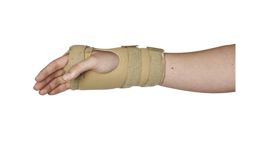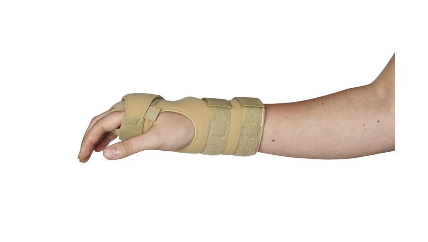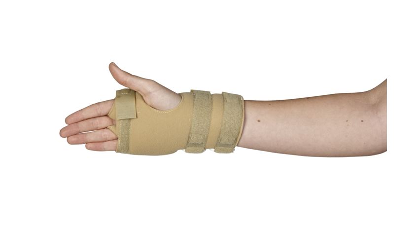A flexible stiffener along splint’s ulnar border maintains neutral wrist alignment. Dual D-ring wrist straps ensure snug, comfortable wrist support. Washable. Hook-and-loop closures.