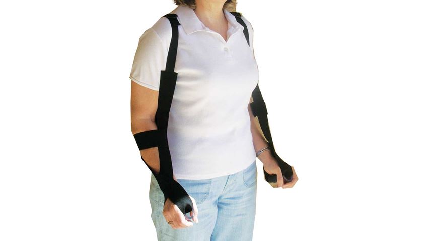 The GivMohr Bilateral Sling provides support to the arms of individuals with bilateral shoulder involvement.