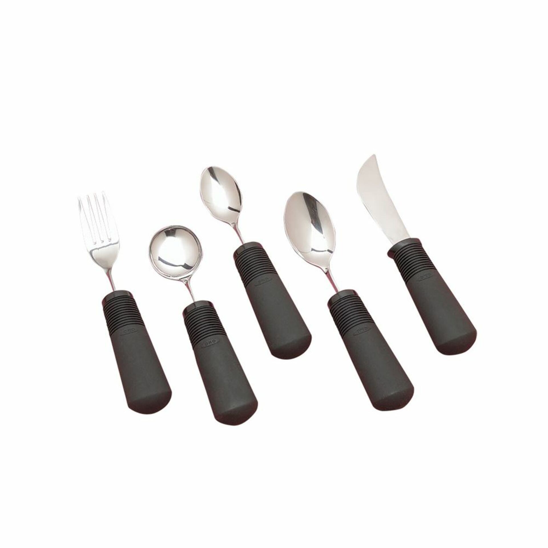 Good Grips® Weighted Utensils Flexible built-up handle with soft ribbing adapts to any grip. With 6 oz of added weight, utensils provide more control to help minimize tremors while eating. Ideal for patients with limited grasp strength. Not made with natural rubber latex. Choose single Teaspoon, Tablespoon, Fork, Souper Spoon™, or Rocker Knife, or a Set of 5 (includes one of each).