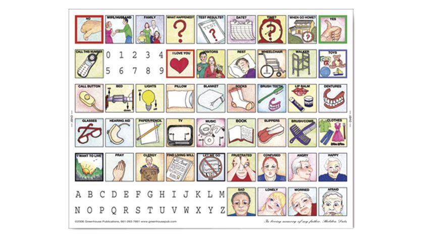 Health Care Disposable Communication Board For clients to communicate medical, physical, and emotional information. Health Care Boards feature 70 pictures, alphabet and numbers on disposable cards for use in long- or short-term situations, at bedside, or in therapy sessions, or left with clients.
