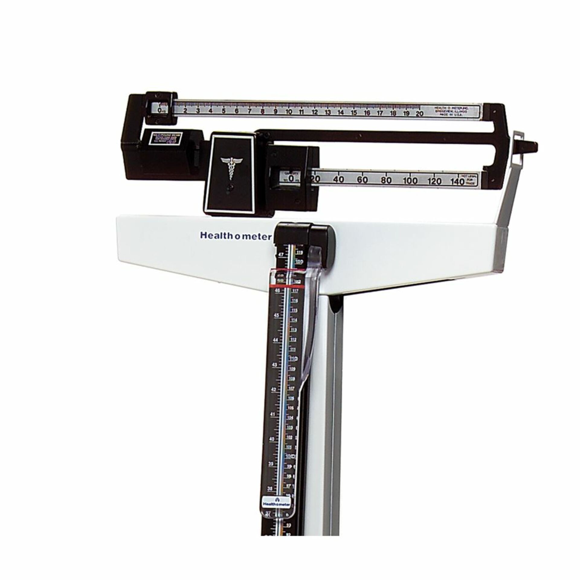Health o meter® Mechanical Beam Scale with easy-to-read, locking, rotating poise bar. One side measures lbs. and the other kilos. Factory calibrated. Heavy-duty base and lever system.