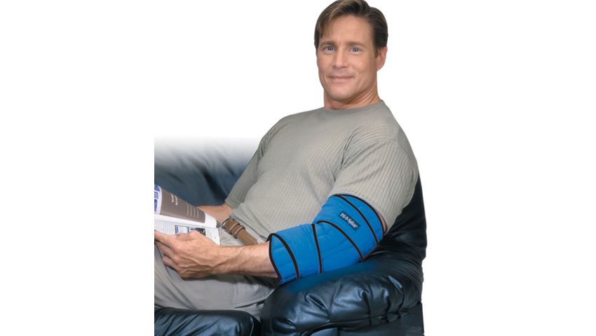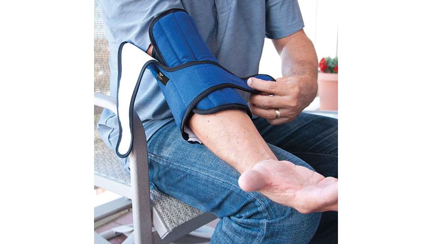 Imak® Elbow Support restricts painful movement of injured elbow during sleep. Luxurious padded cotton splint with two adjustable compression straps. Interior plastic stay slides into hidden pocket to maintain full extension. Remove stay for those who don’t require elbow immobilization. Easy on, easy off. Machine wash. Fits left or right.