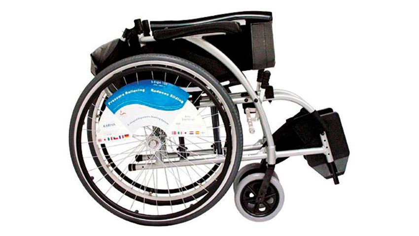Karman Ultra-Lightweight Series 105 Ergonomic Wheelchair Equipped with S-style ergonomic seating to relieve pressure throughout the body. It has 1/4″-thick silver and black removable Aegis antibacterial upholstery, with a machine-washable mesh bottom and small pouch attached to the backrest. Fixed armrest has wide, concave pads. Fixed nonremovable footrest has a tube-in-center footplate that assures better side leg support. Folding back and seat allow for easy transport. Rear wheels are high-profile and flat-free. Extended push-to-lock manual brakes.