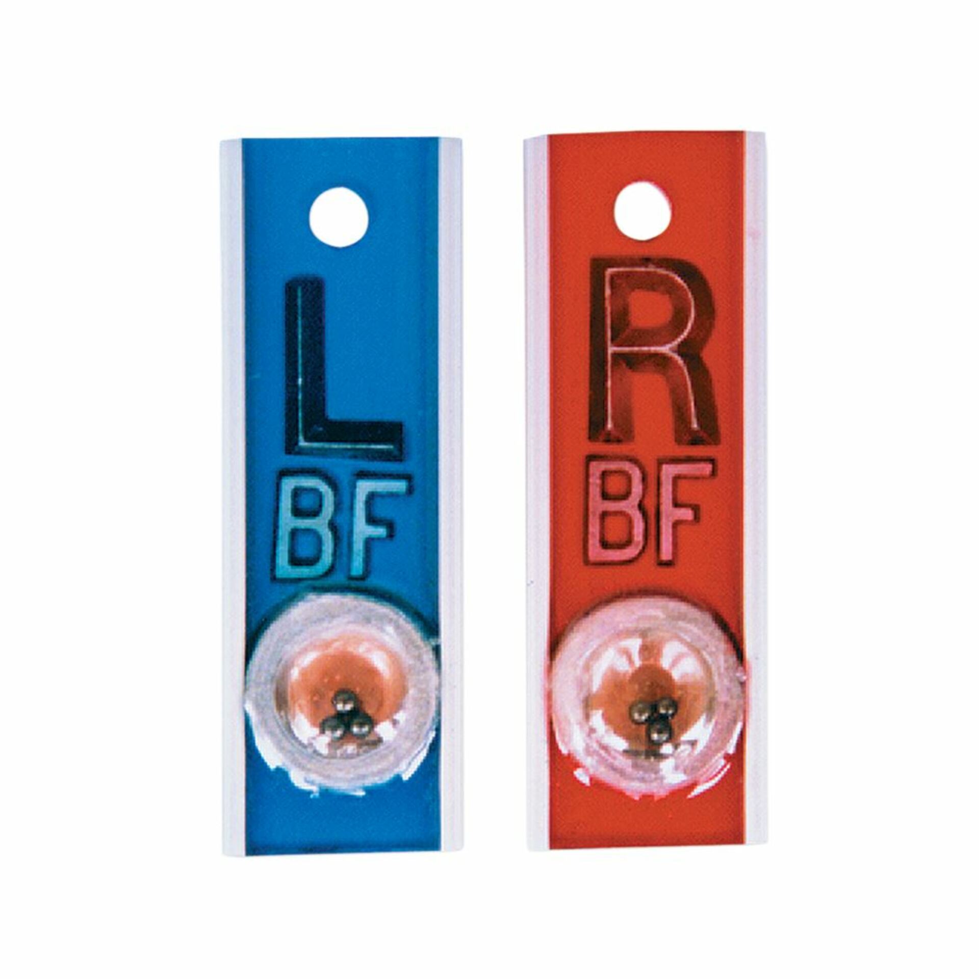 Positioning Markers are color-coded: Blue (Left) and Red (Right). Letters are 5/8″H. Elite and Identifier markers have a hole in top for easy hanging on storage rack. Double Clip-on styles are a single unit that clips onto the cassette, color-coded with Blue (Left) on one side and Red (Right) on the other.
