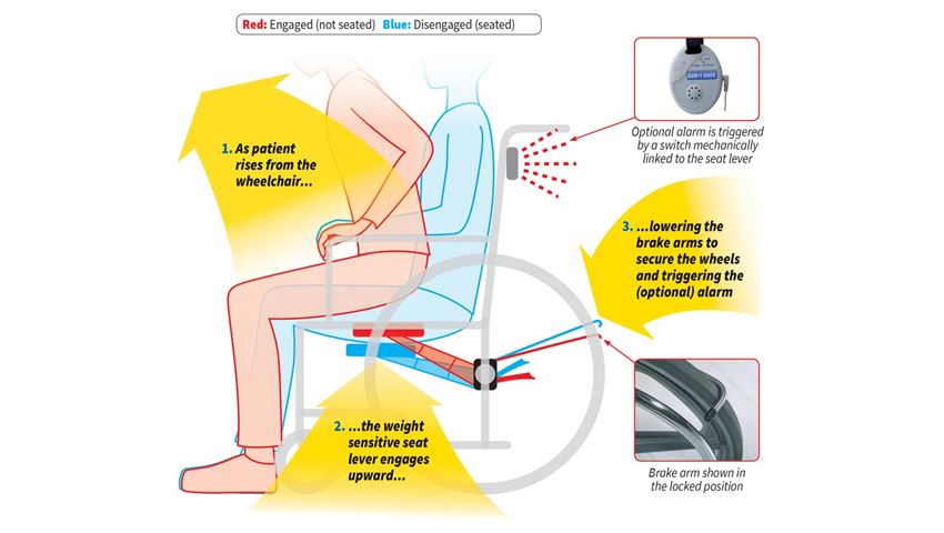 How it works: As the patient rises from the wheelchair, the weight-sensitive seat lever engages upward, lowering the brake arms to secure the wheels. When the patient sits, the brake arms unlock automatically, allowing the chair to roll freely. Temporary override lever attached to the back of the wheelchair disengages the braking system when the wheelchair is unoccupied. No batteries needed. Optional tamper-resistant Alarm can be added for extra security and is triggered by a switch that is mechanically linked to the seat lever.