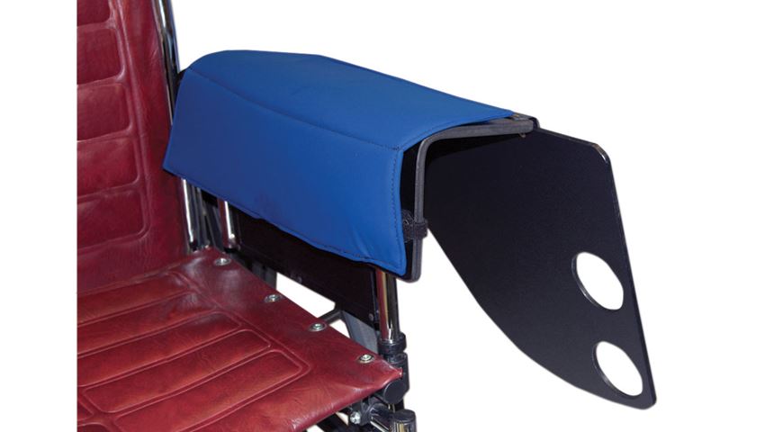 SkiL-Care™ Flip-Top Tray with Cup Holder easily flips up to make exiting from the wheelchair easier. Easy to wipe clean. Stable hard surface is solid and scratch-resistant. Side and armrest are padded to protect user’s skin when in flipped-down position. Features two cup holders. Choose either Right or Left. Black with Royal Blue pad.