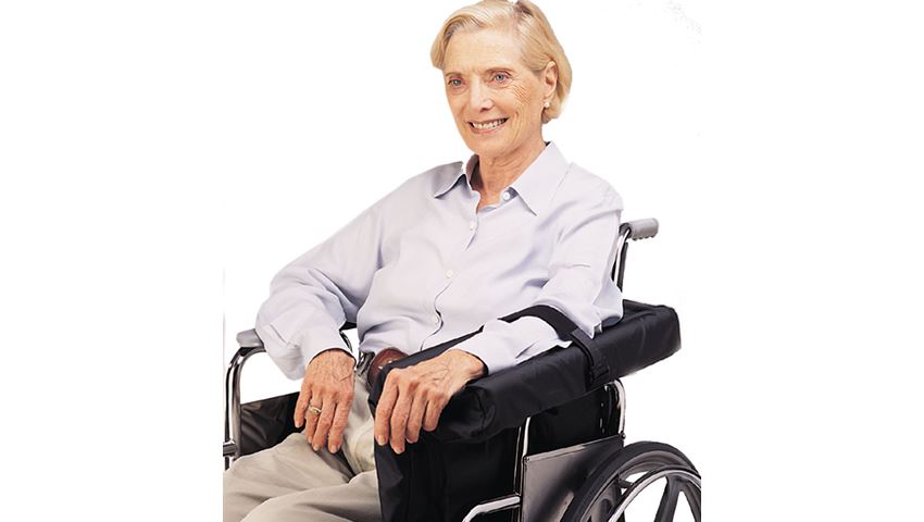 SkiL-Care™ Lateral Arm/Body Support supports arm. Improves sitting posture for resident who leans toward the affected side. Vertical support stabilizes torso. Foam-cushioned arm trough supports paralyzed arm. Choose from synthetic sheepskin, polyester, or nylon covers. Use left or right. Fits standard wheelchair or geriatric chair.