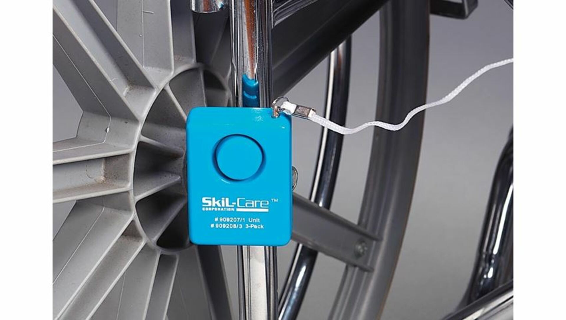SkiL-Care™ Wheelchair Econo Alarm secures to any wheelchair. Clips to patient’s clothing and warns caregiver of wheelchair exit. Helps prevent falls and injuries. Rugged, long-lasting design. Guaranteed for six months or we’ll replace it. Includes 9V battery and chair attachment.