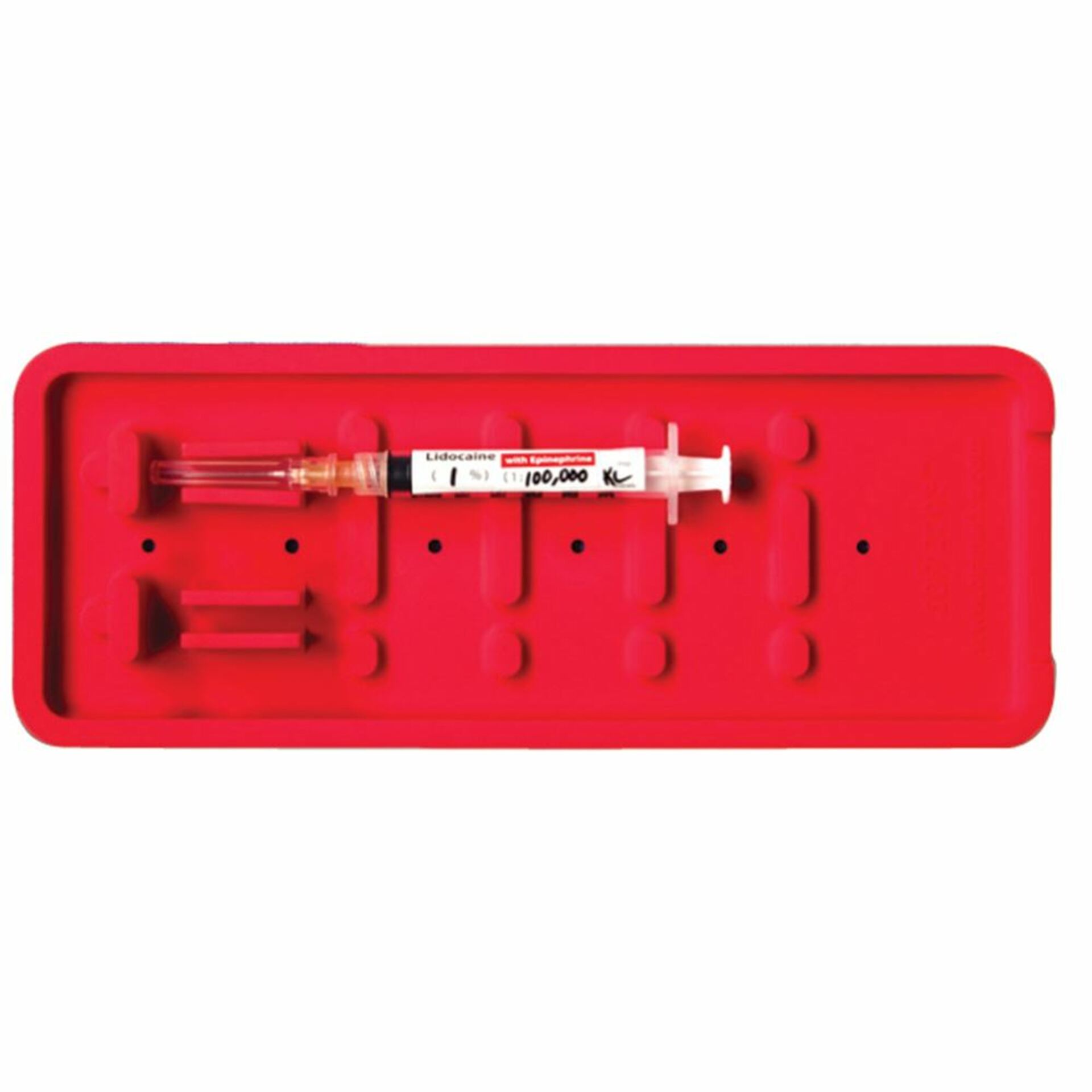Soffzone® Safety Trays Re-sterilizable silicone trays save money and reduce biowaste. Highly visible red color provides an easily recognizable neutral zone. Reusable and autoclavable throughout hundreds of procedures. Raised silicone contours securely grips instruments while low-profile design minimizes blind reaching for sharps. Nonmagnetic to reduce the risk of magnetizing instruments. Sized for use on mayo stands, eliminating the need to place neutral zone on patient. Mini Tray has a reduced footprint for single sharps. Syringe Holder has needle-capping guards. Case of 6.