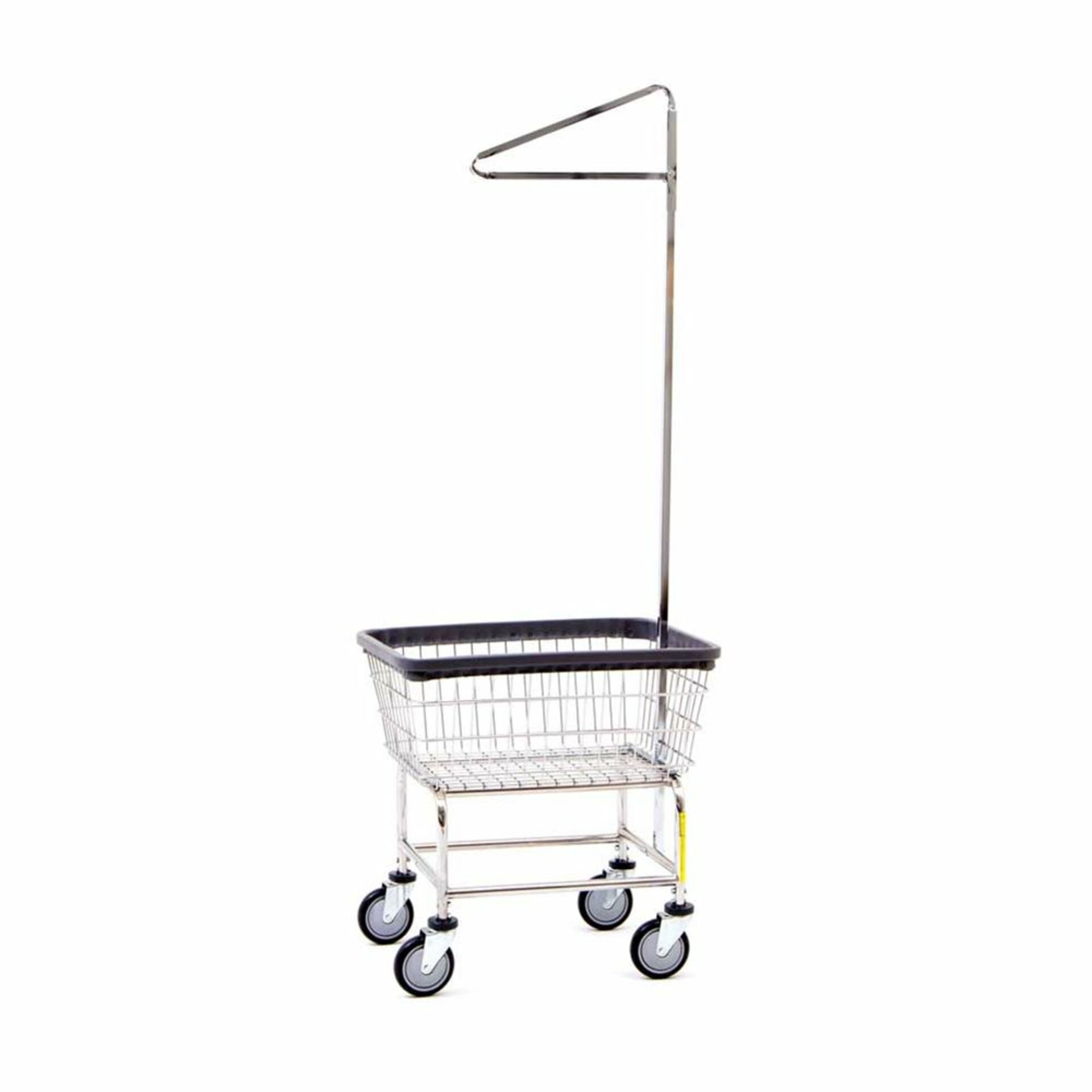 Standard Laundry Cart Basket is 9- and 3-gauge wire with either plated chrome finish or co-polymer coating. Equipped with a gray bumper for protection. Four 5″ Clean Wheel System casters prevent lint and thread pick-up. Add a single or double pole rack to push or hang clothes. Specify Base Color (Chrome, Beige Durguard, or Grey Duraguard) and Basket Color (Chrome, Almond, White).