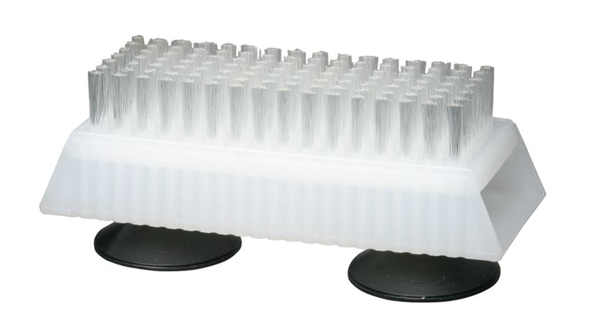 Suction Base Fingernail Brush with two rubber suction cups. 4″L. Plastic. White.