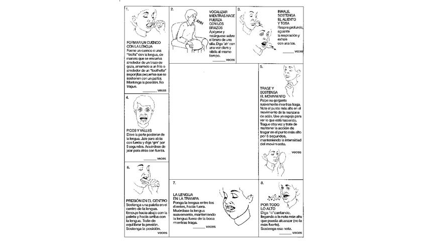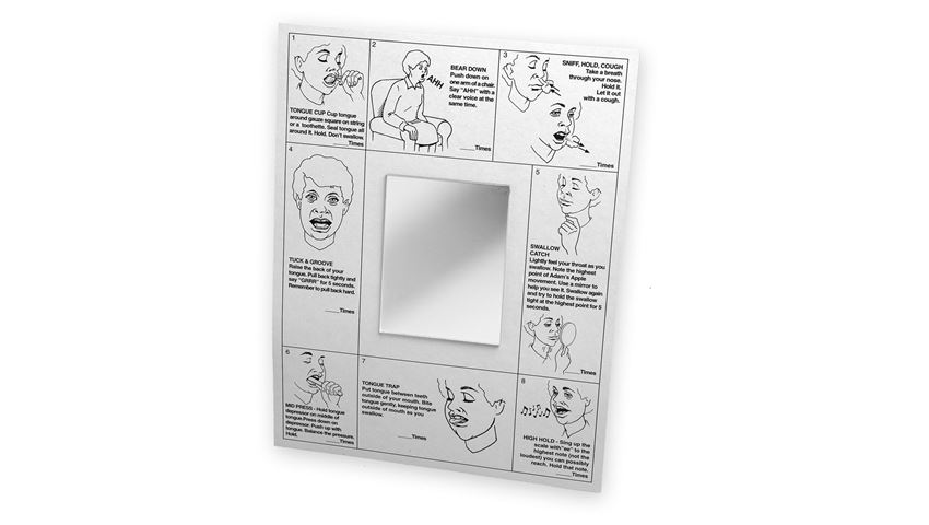 swallowing exercises and mirror all on one chart! New additional exercises are available to help maximize client-family understanding, compliance with the treatment program. Each set reinforces swallowing exercises and encourages strengthening of the specific muscle groups used in swallowing. Nine illustrated exercises with easy-to-read descriptions placed around an acrylic mirror. Back of card includes general suggestions, and space for individual instructions. Available in English or Spanish. Pack of 10.