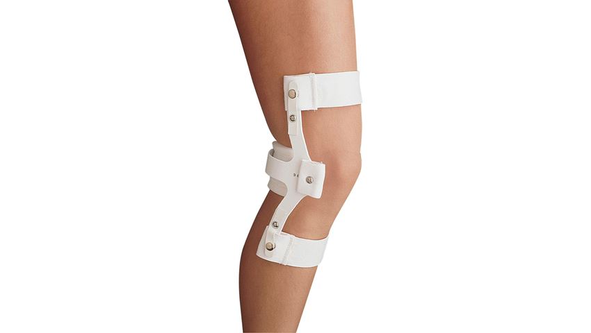 Swedish Knee Cages help manage genu recurvatum. Hinged model (Black) with lightweight aluminum frame and padded straps. Won’t protrude above or below knee while seated. Unhinged model (White) with moldable, lightweight, vinyl-coated, aluminum frame includes adjustable, posterior pressure pad. Permits knee flexion; restricts extension. Fits left or right.