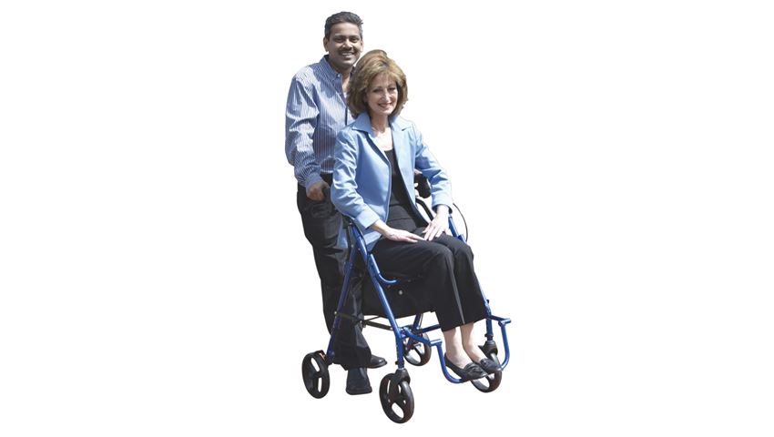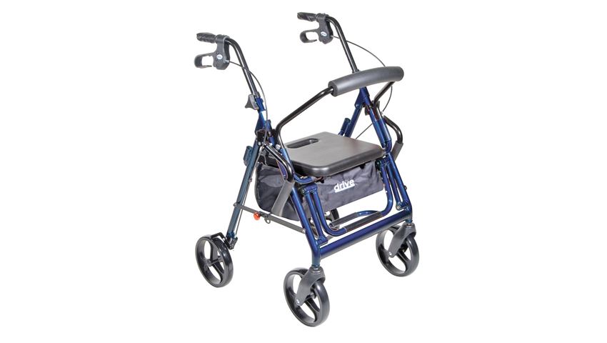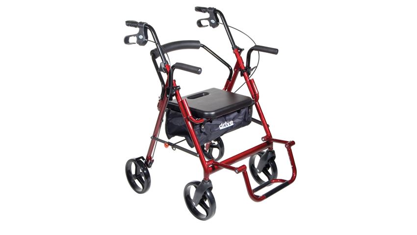 The Duet combines a transport chair and rollator. Patient can ambulate independently or be pushed by caregiver. Easily converts in less than 30 seconds. Seat lock prevents Duet from accidentally folding. Footrest folds down when not in use. For indoor and outdoor use. Available in Blue, Black or Burgundy.