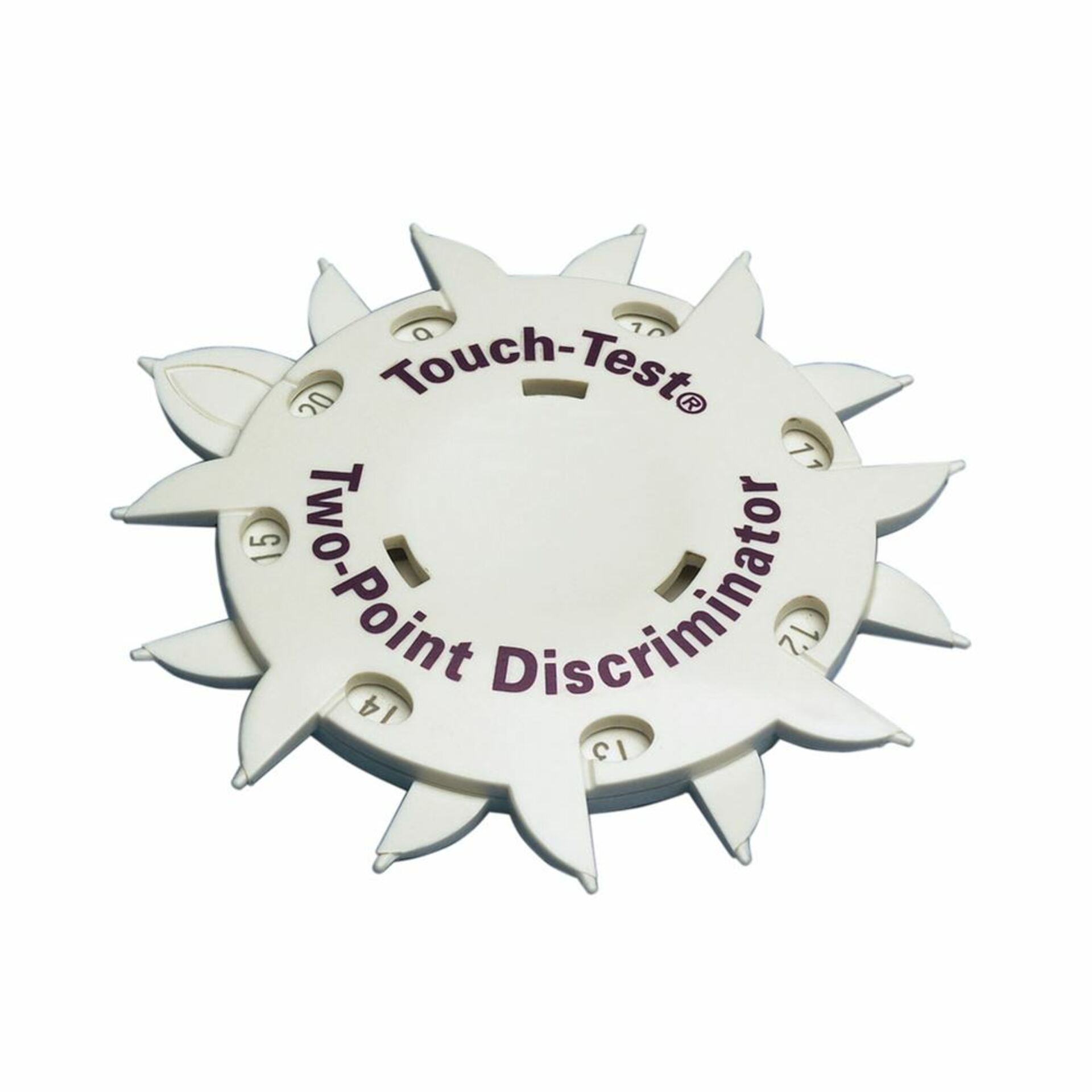 Touch-Test® Two-Point Discriminator Two rotating, plastic disks joined together to test static and moving 2-point discrimination of fingers, toes, or sensory flaps. Touch-Test Two Point Discriminator is ideal for testing following nerve repair, grafts and innervated tissue transfer for desensitization, or to determine the level of impairment. Rounded tips are spaced at standard testing intervals from 1mm to 15mm apart. A 20mm and 25mm spacing also are given. One disk setting tests from 1mm to 8mm, and the other setting tests from 9mm to 15mm. To change settings, just rotate the top disk until it clicks in place. Touch-Test Two-Point Discriminator is easy to read and use. Ideal for the home care therapist and patient home use. Instructions are included. Patent pending.